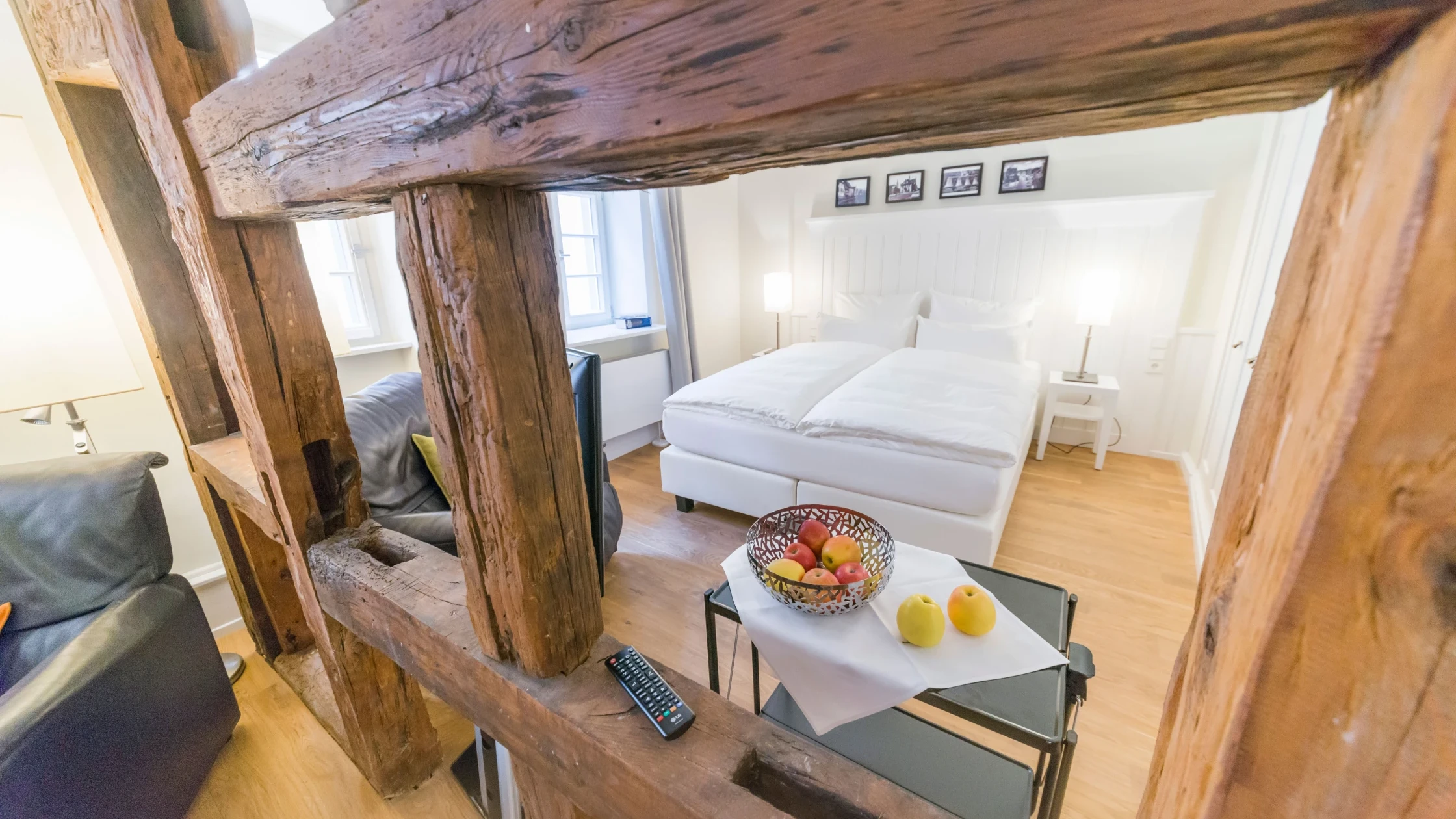 Alle Gästezimmer sind individuell und gemütlich eingerichtet und bieten gleichzeitg allen Komfort modernen Wohnens. Zum Wohlfühlen laden breite Betten mit bester Matratzenqualität, Naturmaterialien, allergikergeeignete Bettdecken mit Baumwollbezügen, gemütliche Sessel , gutes Leselicht und große Flachbildschirme ein. Die massiven Eichendielenböden harmonieren perfekt mit dem alten Fachwerk.